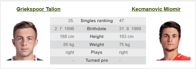 - Griekspoor játékstílusa alapvetően agresszív alapvonaljátékra épül, erőteljes tenyerese és megbízható adogatása lehetővé teszi számára, hogy gyorsan dominanciát építsen ki a labdamenetekben. Univerzális játékos, 2021-ben 6 salakos CH-t nyert, viszont ATP-tornagyőzelme fűről és kemény pályáról van! Idén salakon ATP- tornán döntőzött. Kecmanovic viszont technikásabb, változatosabb játékos, aki jobban érzi a ritmusváltásokat, a mozgása a salakon kiváló, ám mentálisan és stabilitásban hajlamos a visszaesésre, ami idén is többször hátráltatta.