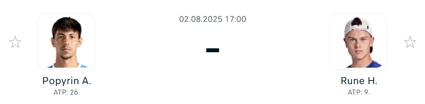 - Popyrin majd két méter magas, igazi erőjátékos, aki technikai téren kevésbé jó, viszont kiválóan adogat és erős alapütései vannak. Alapvonalról stabilan játszik, viszont komplexitásban nem erős, kevés fegyvere van, játéka kiismerhető és aki jól védekezik, az meg tudja verni. Rune Top10-es játékos, rendkívül agresszív, univerzális sokoldalú teniszező. Minden borításon jól tud játszani, a tenisz minden terén kiemelkedő, a mentális téren vannak hullámzások. Ha nem megy neki a játék, akkor küszködik, de ha koncentrált és motivált, akkor nagyon kevesen tudják megverni! Nagyon technikás, nagyon gyors, alapvetően sokkal jobb teniszező, mint Popyrin! Az ausztrál az orosz Medvedevet verte meg 2-1-re egy ilyen sikert nem kell magyarázni, de azért azt nem árt tudni, hogy Medvedev nem volt a legjobb formájában, sokat hibázott.