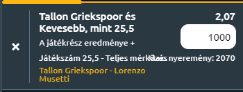 - A választott meccsemen két nagyon fontos tényező befolyásolja a tippet. Az egyik a bevezetőben már említett elődöntő, ami miatt a Griekspoornak fokozottan motiváltnak kell lenni, valamint a borításhoz való hozzáállása a két játékosnak. Griekspoorban van ütőerő, jól szervál, mentálisan erős alapvonalas agresszív játékos, míg az olasz nagyon technikás, de sokkal inkább a salakra termett, ott szokott jó eredményeket elérni. Musetti, bár nagyon sokat javult keményen is, de a túlságosan kemény és pontos tenyeresekkel, valamint az adogatásokkal már nehezebben bír. Griekspoor pedig ebben jó. Ja és egy harmadik tény is van, amely Griekspoor javára billenti el a mérleg nyelvét! Ő ugyanis holland, hazai pályán meccsel és ez is motiválja. A sima győzelem is remek szorzó 1,53-ért, de azt gondolom, ez a meccs két szettes lesz.