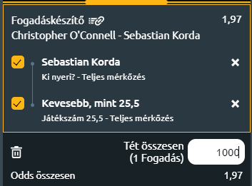 - Korda ellen szerintem már kevés lesz O’Connel bulldogstílusa. Az amerikai játékos egészen más szint, Sonego ellen abszolút jól teniszezett, ma is nyerhet, szerintem 25,5 game-nél nem is lesz több.