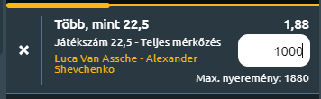 - Két nagy tehetség. Shevchenko 23 éves, univerzális játékos egyre jobban belelendül. Az első évében 2022-ben salakon mutatta meg tehetségét, megnyerve a Bratislava CH-tornát, de aztán idén (2023-ban) már kemény borításokon is pályára lépett és bebizonyította, hogy ott sem tehetségtelen. Tenerifén sikerült is CH-tornát nyernie, majd hozzá tett még egy salakos challenger trófeát. Alapvonalról agresszívan teniszezik, mentálisan is erős, sokra viheti. Az orosz játékos sem idős még a maga 23 évével, de a francia fiatalember mindössze 19 esztendős! Ennek ellenére az egyik legtehetségesebb teniszező, aki jelenleg szárnyait bontogatja. Szintén univerzális játékos, 2022-ben már megnyert egy salakos tornát, 2023-ban pedig egy salakosat és egy kemény pályás tornát is Pau-ban. Idén részt vett a Next Gen vilgábajnokságon, ahol elődöntőt játszott Arthur Filsszel! Kiváló játékos, nagyon sokra viheti! Azt gondolom, ez az a meccs, ahol lehet 23 game.