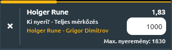 - Holger Rune az egyik legnagyobb tehetséggel megáldott játékos, mindössze 20 éves és 8. helyen áll a világranglistán. Univerzális teniszező, minden téren kiváló adottságokkal bír és megfelelően agresszív is. A bálványa Novak Djokovic, olyan akar lenni, mint a szerb világelső. Ehhez megvan minden alapja, csak szorgalom, szerencse és jó szakmai munka kell még az alázat mellé. Ez utóbbiban kell még fejlődnie. Még talán kicsit forrófejű és emiatt az eredményessége ingadozik. De már most van 4 ATP tornagyőzelme, ebből 2-2 kemény pálya és salak. Boris Becker az edzője, ő ki fog belőle hozni mindent, amit lehet.