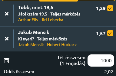- A Fils – Lehecka meccsen a francia játékos friss fizikai állapota kulcstényező lehet. Fils remek teljesítménnyel jutott el az ATP Doha döntőjéig, ahol végül teljesen kifulladt Carlos Alcaraz ellen. A kondicionálisan is a világ legjobbja Alcaraz, bedarálta a végére a franciát! Filsszel kapcsolatban ezen a meccsen ogosan merülnek fel fáradtsággal kapcsolatos aggodalmak, valamint az is kérdés, mennyire viselte meg a közelmúltbeli súlyos sérülése, amelyből nemrég tért vissza. De az biztos, hogy szoros meccs lesz, hiszen Fils néhány nappal ezelőtt Katarban már legyőzte Leheckát, most azonban alacsonyabb szint várható tőle, ami akár kieséshez is vezethet. Legalább 20 game azért várható, mert a felek között már most is szoros a mérleg (2–1), de Fils fáradtsága miatt visszaesés jöhet, ami kiegyenlített, hosszabb meneteket hozhat.