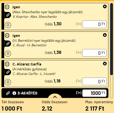 Így a hónap vége felé kicsit elbizonytalanodtam. Meg a meccsek-, tornák is elég kiszámíthatatlanok lettek. A fő szelvényemben ezért inkább az óvatosság vezérelt. A hamburgi döntőt megnyeri Alcaraz, ez nem kérdés, de az, hogy Musettinek lesz-e szettje, vagy sem azt nem merem megjósolni. De a sima Alacaraz-győzelem egynek jó. Mellé agstaadi döntő, ahol Ruud Casper és Berrettini a két főszereplő és a bukik a norvég esélyeit látják jobbnak. Ruud salakon nagyon jó, idén 32 mecccsből 24-et megnyert a vörös porban és nyert két ATP-tornát, valamint döntőzött a Garroson Nadallal. Berrettini higgadtsága, profizmusa és testi ereje révén szintén van esélye minimum egy szettre. Nem tudom elképzelni azt, hogy nem lesz szoros ez a meccs, sőt szerintem még az olasz is nyerhet akár. Szóval itt Berrettininek megszavaztam egy szettet. De hozzá kell tenni, hogy az olasz az egyik kedvenc játékosom, nagyon szurkolok neki mindig! Végül pedig az utolsó meccs a rendkívül tehetséges orosz Shevchenko, aki a kitzbüheli selejtező utolsó fordulójában vív meccset Koprivával. Na az elbizonytalanodás itt jön ki. Alapvetően azt gondolom, hogy simán nyerhet is az orosz, de most nem merem mégsem kiírni. Maradok a szettjénél. A három meccs erős dupla.