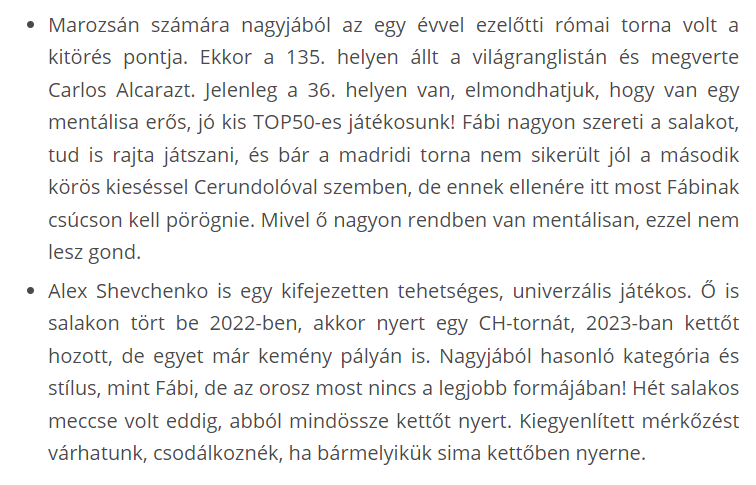 Ez most annyiban módosul, hogy sajnos Fábi sincs jó formában, sőt el kell mondani, hogy a salakos játék egyelőre nem indult be nála idén. Tavaly hasított a vörös porban, még Alcarazt is megverte, idén nem megy neki. Az orosz játékos sincs még élete formájában salakon, neki is nehézkesen megy az átállás. Talán ma szorosabb meccset játszanak majd, mint múltkor, de sajnos inkább Shevchenko esélye nagyobb a győzelemre.