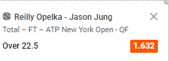 A New yorki fedettpályás ATP viadalon ma egy nagyon érdekes mérkőzésnek lehetünk szemtanúi. A háló egyik oldalán az amerikai óriás Reilly Opelka (40.), aki mindössze 22 esztendős és az egyetlen ATP-tornagyőzelmét ezen a tornán érte el tavaly, a másik térfélen pedig a meglepetésember, a 30 éves taipei, de az USA-ban élő Jason Jung (131.) lesz. Lássuk, mire érdemes fogadni.