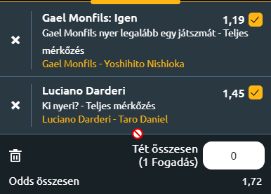 - G. Monfils – Y: Nishioka: Monfils TOP10-es kategória, de már nem fiatal. És bármennyire is jó a genetikája, már nem sokáig fogja bírni az t a fizikai megterhelést, amit az élsport, így az ATP Tour is jelent. Technikailag, erő terén és fejben is kiváló játékos a francia, de Nishioka egyrészt sokkal fiatalabb, másrészt egy igazi védekező-speciaslita, egy futógép, aki mentálisan is nagyon erős. Minden azon múlik, hogy Monfo mennyire bírja fizikálisan ma. Ha igen, akkor leveri a japánt, mert sokkal sokrétűbb teniszező. De ha nem lesz topformában a francia, akkor vereség lesz a vége. A figyelmeztető jel az, hogy Nishioka 2021-ben ugyanitt elverte a bohém gallt. Isén egyiküknek sem túl fényes a salakos mérlege, ezért óvatos vagyok és csak Monfils-szettet választottam.