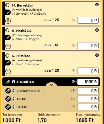 - És végül Nadal-Popyrin. Hagy ne részletezzem. Popyrin tehetséges játékos, de a salakkirály ma oktatni fog. Kettő simában nyer. És aki szeret kockáztatni, az megteheti mindhárom meccset sima kétszettes győzelemre (Cicipasz-Berrettini-Nadal) még ez is lejöhet jó eséllyel!