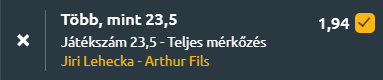 - Picit el van mérve a szorzópár a bukik által, nem lesz ez olyan sima Fils-győzelem, ha nyer is a francia nagyon meg kell izzadnia érte, de jómagam egyáltalán nem látom ilyen esélyesnek! A cseh fiú legalább annyira esélyes ma. A value tipp a fentiek miatt az OVER 23,5 game, ami értékes tipp, ahol a potenciális profit a valószínűségekhez képest kedvező!