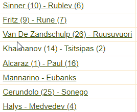 - A két középkategóriás játékos, aki idáig elverekedte magát. Ruusuvuori sokat fejlődött, jó kis kemény pályás teniszt játszik, de ez nem erőtenisz. Nagyon hasonló a fizikai felépítésük is Van De Zandschulpéval, de amíg a holland inkább a brusztolós, kitartó védekezést játssza, a finn agresszívabban teniszezik. Ezen a gyors kemény borításon én Ruusu győzelmét várom.