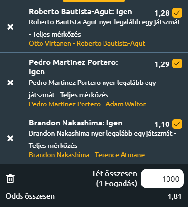- B. Nakashima – T. Atmane: Atmane a feltörekvő francia generáció tagja. Még nincs a TOP100-ban, de már mutatott jó dolgokat. Itt Kukushkint verte két szettben. Nakashima bőven előrébb jár! Ő most egy sérülés miatt visszább csúszott a ranglistán, de még így is jobb. Mentálisan nagyon jó, gyors védekezőjátékos. Nagyon sok van benne, 2022-ben ő nyerte a NextGEN ATP Finalst, és van még egy keménypályás ATP tornagyőzelme. Egyre jobb megint, idén már nyert egy CH-t. Ő már volt TOP50-es és oda tart megint. Nakashima nyer – 1,32, Nakashima szett - 1,10