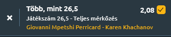 - Mindkét játékos magas szinten teljesít mostanában, és a kemény pálya előnyt jelent számukra az adogatójátékuk és erős ütéseik miatt. Mpetshi Perricard szerváját rendkívül nehéz eredményesen visszaadni amivel stabil alapot teremt a saját játékának, és így tiebreak-re kényszerítheti ellenfeleit. Khachanov tapasztalata és korábbi sikerei azonban magabiztosságot adnak neki, különösen mivel már volt bajnok ezen a tornán. A két játékos erős szervajátéka miatt valószínűleg nagyon szoros mérkőzés lesz, érdemes akár a tiebreak-re is fogasni. Mindketten képesek lehetnek nyerni, így szinte lehetetlen megjósolni a végkimenetelt, és nagyon jó eséllyel mindketten hoznak egy-egy szettet, így az overre szavazok.