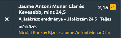 - Aktuális meccs elemzése: Jaume Munar az elmúlt egy évben jelentős javulást ért el keménypályás játékában, és már ebben a szezonban is eljutott egy negyeddöntőig, ezért kedvező esélyekkel várja, hogy nyerjen a tornán. Nicolai Budkov Kjaer tehetséges ígéretes játékos, de még időre lesz szüksége, hogy megszokja ezt a szintet. Munar tapasztalata és taktikai képessége kétszettes győzelmet jelenthet!