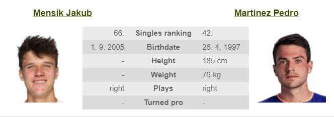 - Viszont a cseh kevésbé hajlamos a mentális megingásra és bizonytalanságra! Ha pedig visszanézzük az igazán erőteljes és agresszív keménypályás játékosok Martinez elleni meccseit (Hanfmann - Martinez: 7-6, 6-2; Popyrin-Martinez: 6-2, 6-4, 6-0; Coric-Martinez 6-4, 6-4) azt láthatjuk, hogy az első szett szorosabb, de utána kienged a spanyol és vereséget szenved, vagy simán kikap. Mensik pedig van az a szint, aki ugyanezt meg tudja tenni vele.