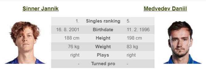 - Mindkét játékos remek formában van, minden téren kiemelkedő játékosok. Medvedev inkább az alapvonali (vagy jóval mögötte) védekező stílusban nagyon erős, kőkemény tenyeresekkel, míg Sinner sokkal agresszívabb és támadóbb felfogású. A mentális érettség és a nyomás kezelésének képessége kulcsszerepet játszhat a mérkőzés kimenetelében. Ebben Medvedev korábban maximum csak közepesnek volt nevezhető, bár az igaz, hogy rengeteget fejlődött ezen a téren az utóbbi években. A mérkőzés kimenetele nagymértékben függ attól, hogy Medvedev mennyire tudja megállítani Sinner agresszív támadásait, míg Sinner hogyan tudja kezelni Medvedev védelmi stratégiáit. Ha Sinner a saját játékát tudja ráerőltetni és képes Medvedev szerváit visszaadni, akkor lehet esélye a győzelemre. De nem lesz rövid meccs.