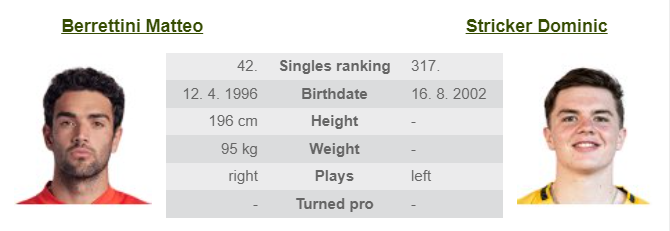 - Stricker fiatal tehetség, mindössze 22 éves, aki szintén erős szervával rendelkezik, és agresszív alapvonaljátékos. A gyors borításokon, mint a fedett kemény pálya, előnyére válik, hogy képes gyors pontokat hozni az adogatásaiból. Az erős szervái mellett a hálójátékban is jól teljesít, de tapasztalatlanabb Berrettinihez képest. Nem annyira tapasztalt, hajlamos kettős hibákra, ami instabilitást okozhat a fontos pillanatokban.