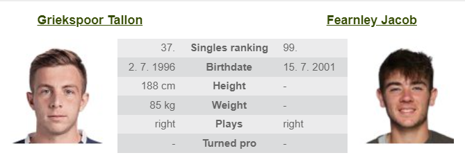 - Jacob Fearnley hét évvel fiatalabb, mintdössze 21 éves. Tehetséges, technikás játékos, aki dinamikusan játszik, különösen a kemény borításokon. Szervája nagy erőssége lehet, de hajlamos a kettős hibákra, ami néha hátráltatja a játékát. Gyorsasága és labdaérzéke lehetővé teszi, hogy jól variálja az ütéseit, de még jóval tapasztalatlanabb, mint Griekspoor. A hibák csökkentése kulcsfontosságú a számára, mivel hajlamos nyomás alatt rossz döntéseket hozni. Ő az elmúlt 10 meccsét mind megnyerte, de a stockholmi selejtező előtt két challengeren vett részt, amiket meg is nyert,