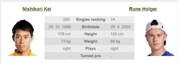 - A dán teniszező rendkívül tehetséges, abszolút TOP10-kategória, de az elmúlt időszakban hullámzó formát mutatott. Játéka leginkább az erős, támadó teniszre épül, különösen keménypályákon érzi otthon magát. Rune fiatal kora ellenére rendkívül agilis, gyorsan mozog a pályán, és képes dinamikus, nagy sebességű labdameneteket felépíteni. A játékában az agresszív alapvonalas ütések dominálnak, és gyakran próbálja rövid labdamenetekkel lezárni a pontokat. Bálványa Novak Djokovic, rá is jellemző az arrogancia, de ezen a téren messze le van maradva példaképétől. Jelenlegi formája felemás. Az elmúlt öt mérkőzéséből hármat elvesztett, legutóbb Hangzhou-ban Uchiyama ellen esett ki nyitómeccsén, ami egy újabb gyenge teljesítmény volt tőle. Rune a közelmúltban elvesztette top 10-es helyezését is. Tokióban viszont legyőzte Tabilót, majd az nyolcaddöntőben Nishiokát is két szettben, ami javulást mutat. Nem lesz könnyű dolga ma a szamurájjal szemben.