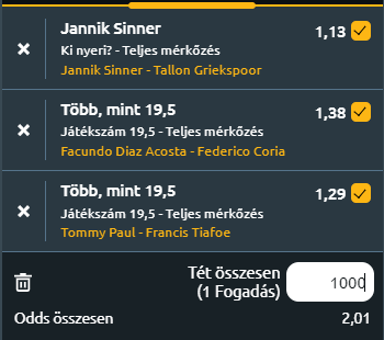 - Sinner – Griekspoor: Sinner nagyságrendekkel jobb teniszező, mint a holland. Hiába van ütőerő Griekspoorban és mentálisan is erős, Sinner is. Kétszettes meccset várok, de szerintem nem lesz agyonverve Griek. Olyan 7-5, 6-4 mondjuk. Tehát a Sinner nyer + kevesebb mint 22,5 game – 1,49-ért jó lehet.