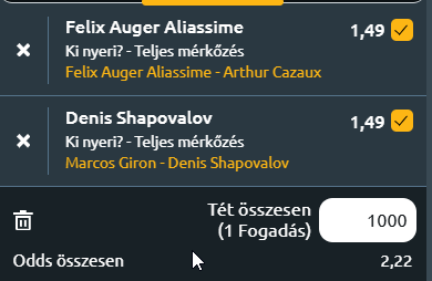 - F. Auger Aliassime – A. Cazaux: Itt az afrokanadai srác tenisztehetségben jóval erősebb, mint a Cazaux, bár hozzá kell tenni, hogy neki is volt egy kiváló sorozata 2024-ben. Mindezek ellenére Auger minden téren sokkal jobb, kivéve a mentális faktort. Még mindig rettenetesen hektikus, de ha megy neki, akkor nagyon kevesen tudják megverni. Főleg a kemény pályát kedveli és mivel a United Cup-on megverte Fritz-et, bízom benne.