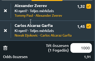 - A másik ágon a két erőember Tommy Paul és Alex Zverev találkoznak. Mindkettő nagyon erős játékos, mentálisan is fizikai erőben is. A technikai téren és talán játékintelligenciában is a német magasabb minőséget képvisel. Mindemellett nagyon jó formában is van. Az ő esélyeit jobbnak tartják a bukik és ma le is kellene hoznia ezt a győzelmet.
