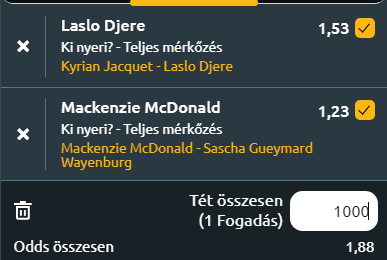 - A másik meccsen szintén egy mentálisan nagyon erős, igazi védekező specialista, Mackenzie McDonald, aki szintén egy fiatal kevésbé tehetséges fiatalemberrel meccsel. A 21 éves Gueymard Wayenburg Sascha még csak most kezd el CH-szinten próbálkozni az ITF-sikerek után. McDonald rendkívül kiegyensúlyozott jó játékos, meg kellene vernie ezt a fiatalembert.