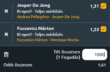 - Jesper De Jong egy agresszív alapvonaljátékos, aki erős tenyeressel, komoly ütőerővel rendelkezik és jó lábmunkával próbálja irányítani a labdameneteket, miközben stabil védekezése van és jól fogad. Andrea Pellegrino technikás, variábilis játékos, aki szereti a hosszabb labdameneteket, jól használja a pörgetéseket és a szögleteket, hogy kibillentse ellenfeleit az egyensúlyukból. De ütőerő terén elmarad de Jongtól és komplexitásban is a holland jobb, mindenféle borításról van már tornagyőzelme. Ha De Jong jó formában lesz, le tudja győzni Pellegrinót.