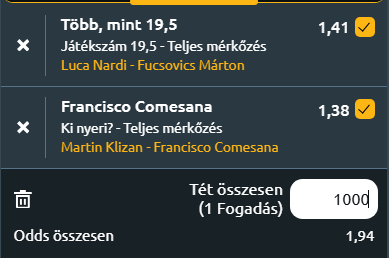 - Luca Nardi egy fiatal, technikás játékos, akinek stílusa jól illeszkedik a salakos borításhoz. Mozgékony, jó labdaérzékkel rendelkezik, és képes hosszú labdameneteket játszani. Erőssége a stabil alapvonaljáték, amelyet pontos ütésekkel és türelmes építkezéssel kombinál. Gyengéje lehet a tapasztalatlansága és a fizikai állóképessége hosszabb mérkőzéseken, valamint az, hogy egy erősebb és agresszívabb ellenféllel szemben nehezebben találja meg az ellenszert. Mentálisan viszont erős, kitartó, ebben pedig jobb, mint Fucsovics! Marci fizikálisan erős, tapasztalt játékos, akinek nagy ütőereje és stabil védekezése a legnagyobb erősségei közé tartozik. Jó az állóképessége, és képes magas intenzitás mellett is kiegyensúlyozott teljesítményt nyújtani. Gyengéje, a mentális faktor, és ha nincs rendben fejben, akkor hajlamos lehet ki nem kényszerített hibákra. Fucsovics agresszivitása és rutinja miatt alapvetően esélyesebb, de Luca Nardi kitartó, technikás játékos, aki salakon képes kibillenteni mentálisan a magyar játékost. Hosszabb meccset várok, amin akár meglepetés is születhet. Tipp: Több, mint 19,5 game