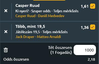 - Jack Draper balkezes, agresszív alapvonaljátékos, aki jól variálja a tempót, és szervájával is sok nyomást helyez ellenfeleire. Bár elsősorban gyors borításon bontakozik ki igazán, az utóbbi időben salakon is egyre versenyképesebb. Fizikai adottságai kiválóak: erőteljesen mozog, és képes diktálni a játékot hosszú pontokon keresztül is. Arnaldi egy technikás, intelligens olasz játékos, aki szereti a taktikusan felépített támadásokat, salakon pedig kiemelkedően érzi a pályát. Mozgása laza, gyors, és jól használja az ellenfél tempóját is. Ez a párosítás izgalmas taktikai küzdelmet ígér: Draper erőből próbál majd dominálni, míg Arnaldi a finomabb eszközeivel, pontos helyezéseivel és jobb talajérzékével fog operálni. Az olasz talán kiegyensúlyozottabb ezen a felületen, de Draper fizikai fölénye is döntő lehet, overes meccs várható!