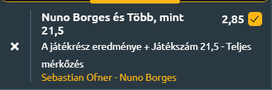 - Ofner jelenlegi formája és salaktudása alapján bőven megnehezítheti Borges dolgát, ugyanakkor a portugál játékos talán jobban kezeli majd a kulcspillanatokat, főleg ha elhúzódik a mérkőzés. Mindezt összevetve, Borges esélyesebb, de hosszú meccs várható sok game-mel!