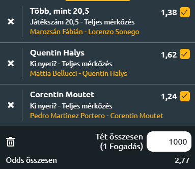 - Marozsán Fábián – Lorezo Sonego: Mindketten nagyon kitartóak, erősek védekezésben, agresszívan játszanak alapvonalról. Ez a meccs kifejezetten kiegyenlített esélyekkel indul. Overes a tipp! A 20,5 game fölé tipp 1,38-ért kiváló kiegészítő odds.