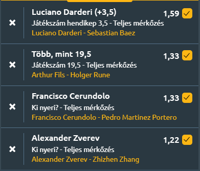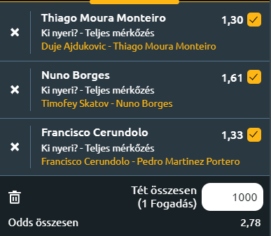 - D. Adjukovic – T. Monteiro: Monteiróval lehet nyerni. Nagyon jó formában van, simán két szettben verte meg Casper Ruud-ot legutóbb. Adjukovic tehetséges játékos, idáig a selejtezőből jutott el, a főtáblán Van Asche-t és Kotovot verte meg. Monteiro sok lesz neki. Meg lehet kockáztatni a Monteiro nyer + kevesebb mint 22,5 game ez 1,96. A sima Monteiro-győzelem 1,30