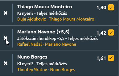 - R. Nadal – M. Navone: Nadal szép játékkal megverte Cam Norriet, most egy fiatalabb és agresszívebb játékos lesz vele szemben Navone személyében. Nagyon tehetséges az argentin, idén már nyert egy salakos CH-t, itt Nagalt verte sima kettőben. Ha Nadal teste bírni fogja, akkor meg fogja verni Navonét, de az biztos, hogy az argentin kondícióban jobb! Ha tudja tartani a lépést addig is Nadallal, akkor lehet esélye. A hendikep bejött tegnap Norrie esetében is, ugyanígy Navonét sem fogja agyonverni Nadal. Tipp: Navone +5,5 – 1,42