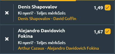 - A. Davidovich Fokina – A. Cazaux: Amikor egy új borításra váltanak a játékosok, az mindig egy kicsi újrakezdés is a szezonjukban. Szükség is van rá, mert mindkét játékos nagyon rossz formában volt az elmúlt hónapokban. Cazaux az utolsó 10 meccséből kettőt nyert meg, Davidovich Fokina pedig hármat. Egyikük sem játszott meccset a füves szezon lezárulta óta. Kettejük közül a spanyol a sokrétűbb játékos, erős alapütésekkel, kiváló keménypályás játékkal, valamint nagyobb rutinnal. Ő volt már a TOP20 kapujában és most szeretne oda visszakerülni. A két rossz formában lévő sportoló közül az alapvetően erősebb játékost várom győztesnek. Tipp: Fokina nyer – 1,57
