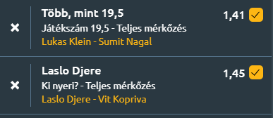 - L. Klein – S. Nagal: Lukas Klein középszerű CH-szint, akinek az alapvető képességei nem rosszak, de összességében túl kevés ahhoz, hogy betörjön stabilan egy TOP50-be is akár. A fűtől eltekintve minden borításon nyert már CH-tornát, salakon többet is. Gstaadban megverte Stan Wawrinkát, ráadásul koncentrált jó játékkal, majd kikapott a későbbi döntős Quentin Halystól. Itt a selejtezőből indulva jutott fel a főtáblára megverve Sachkót és Virtanent. Szerintem a formája nem rossz. Nagal egy igazi darálógép, hatalmas mentális erővel. Az alapvonalon pörög, mint a dízelmotor, mindent visszaad, mindent elér, konstans teljesítményt nyújt. Nincs 70 kiló az ember, így az ütőerő tekintetében vannak tőle jobbak és hát technikailag is. De rendkívül jó védekező tenisze van és mint említettem, mentálisan erős. Klein jóval magasabb, jól szervál, jó alapütései vannak. Ha a jobbik formáját tudná hozni, akkor le tudja győzni az indiai minden labdát visszaadó búgócsigát. De Nagal bulldog-stílusa az alapvonalról fel tudja őrölni az embereket. Tipp: Több mint 19,5 game – 1,41