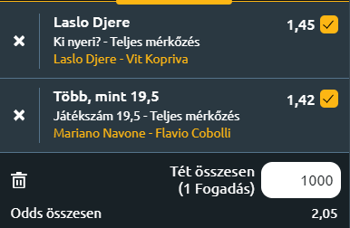- J. Mensik – A. Popyrin: Ezen a tornán tavaly Popyrin nyert, ezért a bukik őt látják esélyesebbnek, révén fontos pontokat véd, ezért koncentrált és motivált lesz. Csakhogy a Tour egyik legnagyobb tehetségével találkozik ma! Jakub Mensik a cseh tenisz egyik legnagyobb ígérete! 2005-ös születésű, még csak 18 éves, de már stabilan a TOP100 tagja. A cseh teniszutánpótlás elképesztően jó! Mensik is egy a sok közül. Djokovic a bálványa, magas erős, de komplex teniszt játszik. Nem csak ütőerő van benne, hanem technikailag is jó és mentálisan is. Nagy jövő áll előtte is. Popyrin elsősorban az adogatásából, az erős tenyereséből, így az agresszív játékáról ismert, de nem tartozik a topjátékosok közé. Vannak jobb szakaszai, meg gyengébbek. Mesnik technikai tudásáról, és intelligens játékát jól mutatja, hogy a leggyorsabb pályaborításon, a füvön megverte nemrég Eubanks-t aki két méternél is magasabb iszonyatos szervája van és kőkemény tenyerese. Mensik képes ésszel játszani és tehetsége okán, képes kezelni ezeket a nagy ütőket! Salakon pedig mindez könnyebb is, mint a gyors pályákon. A bukikkal szembemegyek és minimum egy szettet várok Mensiktől, de a győzelme sem kizárt! Tipp: Mensik szett – 1,43