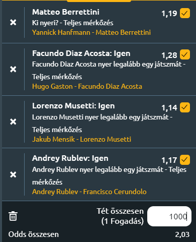 - J. Mensik – L. Musetti: Mindkét játékos nagy kedvencem. Mensik a jövő egyik legnagyobb tehetsége! Minden adott benne, ami ahhoz kell, hogy TOP10 legyen és komoly tornákat nyerjen! Magas, erős, de megfelelően atletikus és gyors is. Ésszel játszik, nagyon technikás, de komoly ütőerő is van benne. 18 éves még csak, de már stbilan TOP100-as és már megvan az első CH-ja, salakon. Univerzális játékos, minden borításon képes játszani. Itt Popyrint, Darderit és Tsenget verte sima kettőben mindet! Musetti viszont már túl sok lesz. Az olasz minden borításon rendkívül erős, gyors, technikás, minden labdát elér. Az egyik legnagyobb tehetség most, aki már tulajdonképpen stabil TOP20-as játékos. 2 ATP tornagyőzelem és 2 CH, de most már minden tornán a legjobb négy közelében van. Szerintem ő még sok Mensiknek, de ők mindketten azon játékosok közé tartozik, akik az elkövetkezendő 10 év egyik kiemelkedő játékosa lesz. Musetti már az 22 évesen. Tipp: Musetti nyer – 1,49