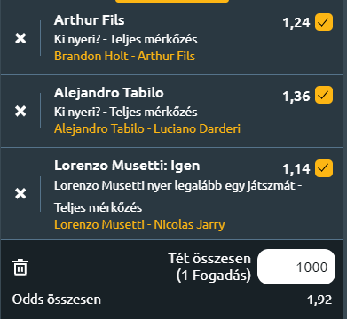 - A. D. Fokina – F. Tiafoe: Mindkettő erős, jó keménypályás játékos, hasonló szinvonalon. Over 20,5 8/10