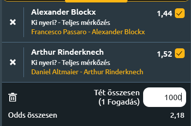 - Francesco Passaro technikailag képzett játékos, aki különösen salakon érzi jól magát, és stabil alapvonaljátékot nyújt. Erősségei közé tartozik a kiegyensúlyozott mozgás, a pontos első szervák és a visszajátszásokban mutatott hatékonyság. Viszont a második szervája nem elég meggyőző, a breakpontok kihasználása alacsony, és a nyomás alatt való védekezése gyakran összeomlik. Alexander Blockx egy fiatal, 20 éves belga teniszező, aki egyre inkább feljebb lopakodik a világranglistán. Blockx játékstílusa agresszív, gyors tempójú, és különösen a kemény borításokon hatékony. 191 cm-es magassága előnyt jelent a szerváknál, erős a tenyerese is, így jó arányban nyeri meg az első szervás pontokat. Erősségei közé tartozik a támadó alapvonaljáték, a gyors lábmunka és a mentális stabilitás. Nyilván rutinra még bőven szüksége van. Blockx jó formában van, Pozsonyban nyert CH-tornát, míg Passaro játéka inkább a salakra való. Belga győzelmet várok.