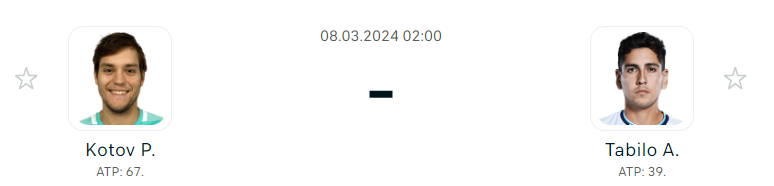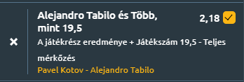 - Kotov egy 191 cm magas erőgép, de játéka közel sem színes, technikai téren már csak egy közepes szint. Megüti szervát bolondul, meg erős tenyerese van. De színezni nem tudja a játékot, aki viszont jól fogad és technikailag jobb játékos, az veri. Tabilo játéka sokkal komplexebb és bár ő alapvetően salakos, ezt a lassabb kemény borítást is kifejezetten tudja játszani. 2021-ben és tavaly is ért el itt sikereket. Azóta pedig remek formába került, idén megnyerte Auckland-et, ami kemény borítás! Kotov hozni fogja a szerváit zömmel, de Tabilo komplexebb játéka végül érvényesül majd. Ezen a meccsen jó esély van az overre 19,5-re és Tabilo győzelmére is egyben!