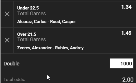 - Sajnos reggel, amikor e sorokat írom, még nem volt TIppmixpro-szorzó, ezért egy másik ajánlatból merítettem a számokat. A Tippmixprót érdemes megvárni, mert ott lesz kombinációs-lehetőség is. Alapvetően Zverev győzelmét lehet kombinálni az overes game-számmal (21,5over) a másik találkozón pedig vagy kétszettes Alcaraz-győzelmet kell választani, vagy Alcaraz-győzelme kombinálva az game-ek számával (under 22,5)