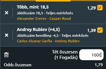 - Alcaraz jelenlegi egészségi állapota bizonytalan, mivel a Ruud elleni meccs során betegséggel küzdött, és a legutóbbi edzésén is mindössze tíz perc után abbahagyta a játékot. Ha Alcaraz nem teljesen egészséges, az Rublev számára nagy esélyt jelent, mivel Rublev stabil alapjátéka egy nem 100%-os Alcaraz ellen döntő előnyt jelenthet. Rublev szintje talán elmarad a legjobbaktól a legnagyobb versenyeken, de ezen a találkozón, Alcaraz állapotát figyelembe véve, ő lehet az esélyesebb. Adjunk Rublevnek + 4,5 game előnyt és a két tipp egy jó szorzót ad ki együtt!