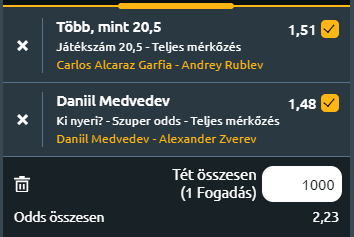 - C. Alcaraz – A. Rublev: Ezen a az ATP Finals tornán mindenki igyekszik a legjobbját nyújtani, hiszen a Grand Slam tornák után/mellett ez a nem hivatalos világbajnokság talán a legfontosabb torna a szezonban. Mindkét játékos csipkedte magát legutóbb. Alcaraz egy egészen rossz időszakot zárt le legutóbb, amikor Zverev ellen kikapott. A vereség ellenére a játéka egyáltalán nem volt rossz. Ha ez a tendencia folytatódik, akkor ő még vissza tud térni a versenybe, de ehhez ma nyerni kell Rublev ellen. Aki viszont kiváló formában volt a tornát megelőző hónapokban. Az egyik legagresszívabb teniszező és most az adogatása és a fonákja is rendben volt. Mindez pedig kiegyenlíti a mérleg nyelvét akkor is, ha Alcaraz jól játszik. A spanyol univerzalitásban jobb játékos. Sokkal technikásabb, gyorsabb teniszt játszik, bár ez a borítás már nem a legideálisabb neki. Ha mindkét teniszező hozza azt amit tud, akkor azért Alcaraz jobb játékos, főleg azért, mert tud alkalmazkodni és tudja váltogatni azokat a stratégiákat, ami kell neki. Rublev egyet tud, de azt nagyon. Szóval én itt szoros meccset várok és Alcaraz győzelmét. De a tippem a gamek számára vonatkozik ma. Tipp: Több mint 20,5 game – 1,51