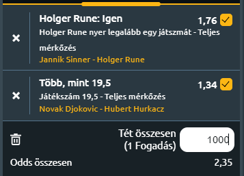 - N. Djokovic – H. Hurkacz: Djokovic két maratoni meccsen van túl és lehet, hogy olyan csoda-gumibogyószörpöt kortyolgat a labdamenetek között, amitől még Lance Armstrong tán ma is megnyerné a Tour de France-t, meg a szerb mellkasára is van valami szuperkütyü felragasztva, ami ki tudja mire jó, szóval mindezek ellenére azért csak 36 éves múlt és határai vannak a kondícionális erejének! Egészen biztos, hogy fáradt lesz és ezen a szupergyors pályán egy kipihent-, ágyúgolyó-szervákat odapakoló Hurkacz ellen nagyon nehéz dolga lesz! Viszont neki a Sinner elleni vereség után két szettben kellene megvernie a lengyelt ahhoz, hogy versenyben maradjon biztosan. Ha kikap, vagy csak három szettben nyer, akkor a Rune-Sinner meccs eredményétől függ a továbbjutása. Hurkacz számára ez egy hatalmas jutalommeccs, aminek csakis maximális motivációval lehet odaállni! Tulajdonképpen számára nincs tét, csak a dicsőség. És biztos vagyok abban, hogy oda teszi magát. Márpedig az ő adogatását nagyon nehéz kezelni, így benne van a tie-break és benne van a szettgyőzelem is. Tipp: Over 19,5 game – 1,34