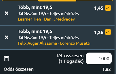 - Két remek, nagyon technikás játékos találkozik Shanghai kemény borításán. A kanadai játékos remek formában érkezik erre a találkozóra. Az amerikai Grand Slam elődöntős szereplése óta stabilan és magabiztosan teniszezik, s ezen a héten is erőteljes kezdést produkált. Auger-Aliassime kemény alapvonalütései, gyors tempóváltásai és agresszív játéka különösen hatékony ezen a borításon, ahol ütőereje komoly előnyt jelenthet. Különösen Musetti egykezes fonákját célozva képes lehet dominálni a labdameneteket. Mentálisan viszont kalap kaka a gyerek, ha nincs ott fejben, akkor bárkitől képes kikapni! Musetti technikás, változatos játéka sokszor megzavarja ellenfeleit, és taktikai érettségét mutatja, hogy képes ritmust váltani a mérkőzések során. A rövidítései különösen hatékonyak lehetnek Auger-Aliassime lendületes, támadó stílusa ellen, de kérdés, hogy ez elég lesz-e a fizikai fölényben lévő kanadaival szemben. Legalább 20 game itt is várható!