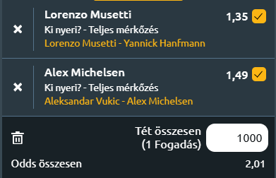 - Az amerikai játékos egyre inkább beérik, az adogatásra alapuló agresszív játéka ezen a fedett kemény pályán jól kijön. Ráadásul technikai téren is jó. Vukic sokat fejlődött, de fedett mérkőzést kettőt játszott eddig. Michelsen esélyesebb jóval!