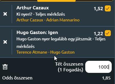 - Atmane a hatalmas szervákra és erőteljes tenyeresekre épít, míg Gaston változatos, technikás játékkal és stabil védekezéssel operál, gyors és kiváló lábmunkája van. Atmane kiszámíthatatlan formában érkezik, hiszen bár voltak kiugró eredményei, a kulcspillanatokban elkövetett kettős hibák megnehezítették a dolgát. Ezzel szemben Gaston friss fedett pályás tornagyőzelemmel a háta mögött magabiztos, és idei 13–3-as mérlege is azt mutatja, hogy remekül érzi magát ezen a borításon. Gaston formája jó, de a múlt heti tornagyőzelem óvatossá tesz, ezért csak Gaston-szett a tipp.