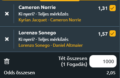 - Kyrian Jacquet egy jobbkezes, kétkezes fonákot használó francia játékos, aki a kemény pályát szereti, van egy megfelelő szervája, bátor, agresszív alapvonaljátékot játszik, mentálisan is erős. Gyengeségeként említhető, hogy Grand Slam szinten még nem szerzett győzelmet, és nincs tapasztalata magas szintű ATP-tornákon. Cameron Norrie hozni fogja a szokásos rendkívül agresszív szilárd alapvonaljátékát, kiválóan védekezik és mentálisan a világ legjobbjai közé tartozik. A rutinbéli fölényének köszönhetően várhatóan bedarálja a franciát.
