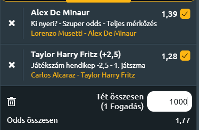 - Musettinek nem igazán megy a játék, tegnap az első körben tükörsimán kapott ki, láthatóan nem volt képes felvenni a kemény pálya ritmusát. Az adogatás nem ment, 12 breaklabdája volt Fritz-nek. Alex de Minaur játékát a kivételes gyorsaság és a védekező képességek határozzák meg ebben hasonlítanak egymáshoz. Az ausztrál játékos híres arról, hogy szinte minden labdát vissza tud hozni, és rendkívül nehéz ellene pontot nyerni. Erősségei közé tartozik a kitartás, a mentális szívósság és a taktikai érettség, amelyek révén képes hosszú labdameneteket nyerni és hibára kényszeríteni ellenfeleit. Lorenzo Musetti az elmúlt öt mérkőzéséből hármat megnyert. A múlt héten Athénban jó sorozatot produkált, de a döntőben három szoros szettben kikapott Djokovic ellen. Djokovic visszalépése után Musetti kapta meg a helyet itt. A fogadóirodák szerint de Minaur az enyhe esélyes és ez így is van. Sokkal jobb formában van, mint az olasz. Tipp: Nyer De Minaur