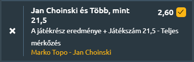 - Choinsky esélyesebb a győzelemre, mert a pálya adottságai kedveznek az erőteljes szervájának és támadó stílusának. Idén már találkoztak egymással salakon, ahol Choinsky nyert, de csak három szettben, szoros mérkőzésen. Ez arra utal, hogy Topo képes megnehezíteni a dolgát, és most is kiegyensúlyozott, kemény meccsre lehet számítani. A rutin és a fizikai fölény Choinski mellett szól, de Topo stabil alapütései miatt a mérkőzés várhatóan hosszú lesz, és könnyen meghaladja a 21 játékot.